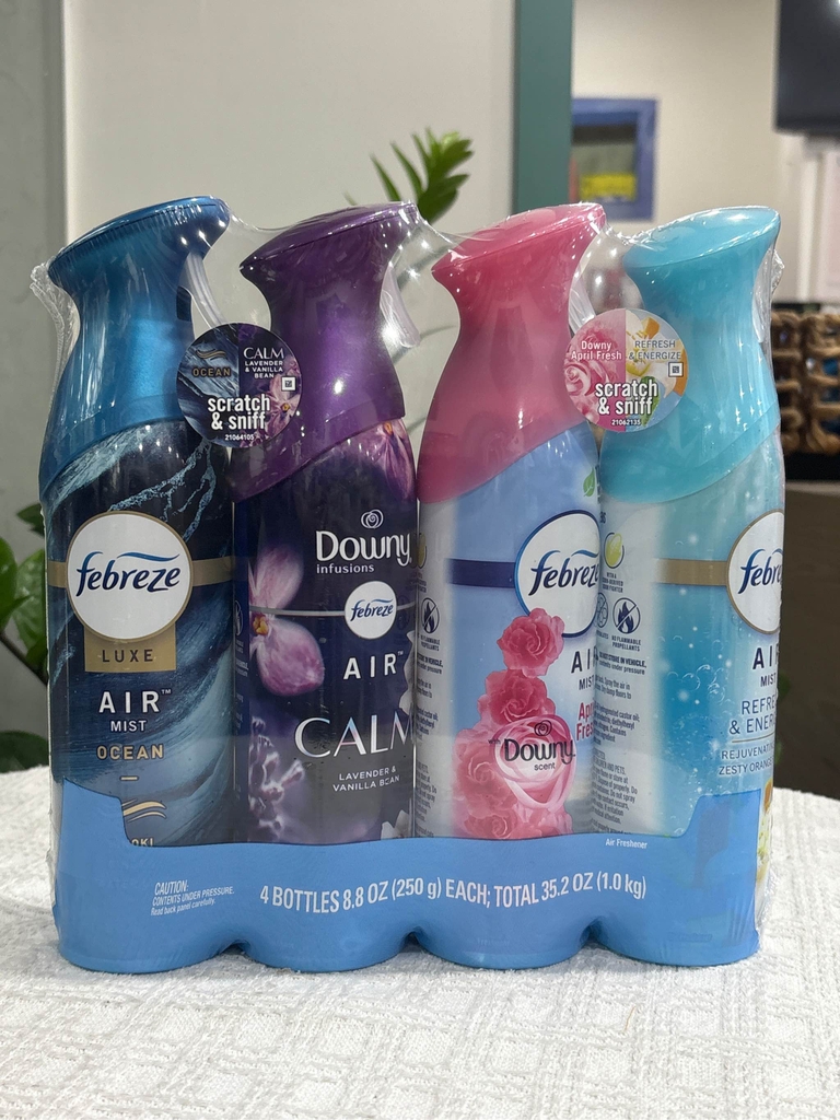 Combo xịt thơm phòng Febreze Air Mist nhập khẩu với 4 mùi hương dễ chịu, giúp khử mùi nhanh và mang lại không gian thơm mát cho phòng ngủ, phòng khách, nhà bếp hay xe hơi. Sản phẩm không chỉ che mùi mà còn giúp loại bỏ mùi khó chịu hiệu quả, để lại hương thơm nhẹ nhàng, thư giãn.