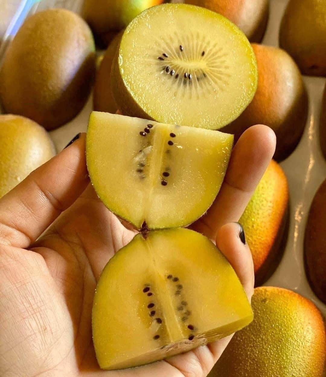 Kiwi vàng có nguồn gốc từ Trung Quốc nhưng được trồng và phát triển mạnh mẽ tại New Zealand. Khác với kiwi xanh, kiwi vàng có vỏ mỏng hơn, màu nâu nhạt và ít lông tơ.Phần thịt bên trong có màu vàng óng ánh, điểm xuyết những hạt đen nhỏ li ti, tạo nên một vẻ đẹp hấp dẫn và bắt mắt. Hương vị của kiwi vàng được đánh giá là ngọt đậm đà hơn kiwi xanh, với độ chua nhẹ nhàng và hương thơm đặc trưng.