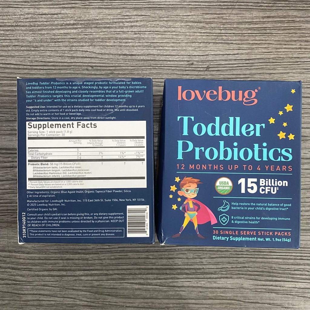 LoveBug Toddler Probiotics là men vi sinh cao cấp dành riêng cho trẻ nhỏ trong giai đoạn phát triển hệ tiêu hóa và miễn dịch. Sản phẩm cung cấp 15 tỷ lợi khuẩn CFU với 8 chủng vi sinh thiết yếu, hỗ trợ cân bằng hệ vi sinh đường ruột, giúp bé tiêu hóa tốt hơn và tăng cường đề kháng tự nhiên.