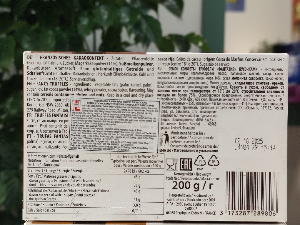 * Dầu thực vật (có thể bao gồm dầu cọ, dầu hạt cải, v.v.): Giúp tạo độ mềm mịn cho truffle.
